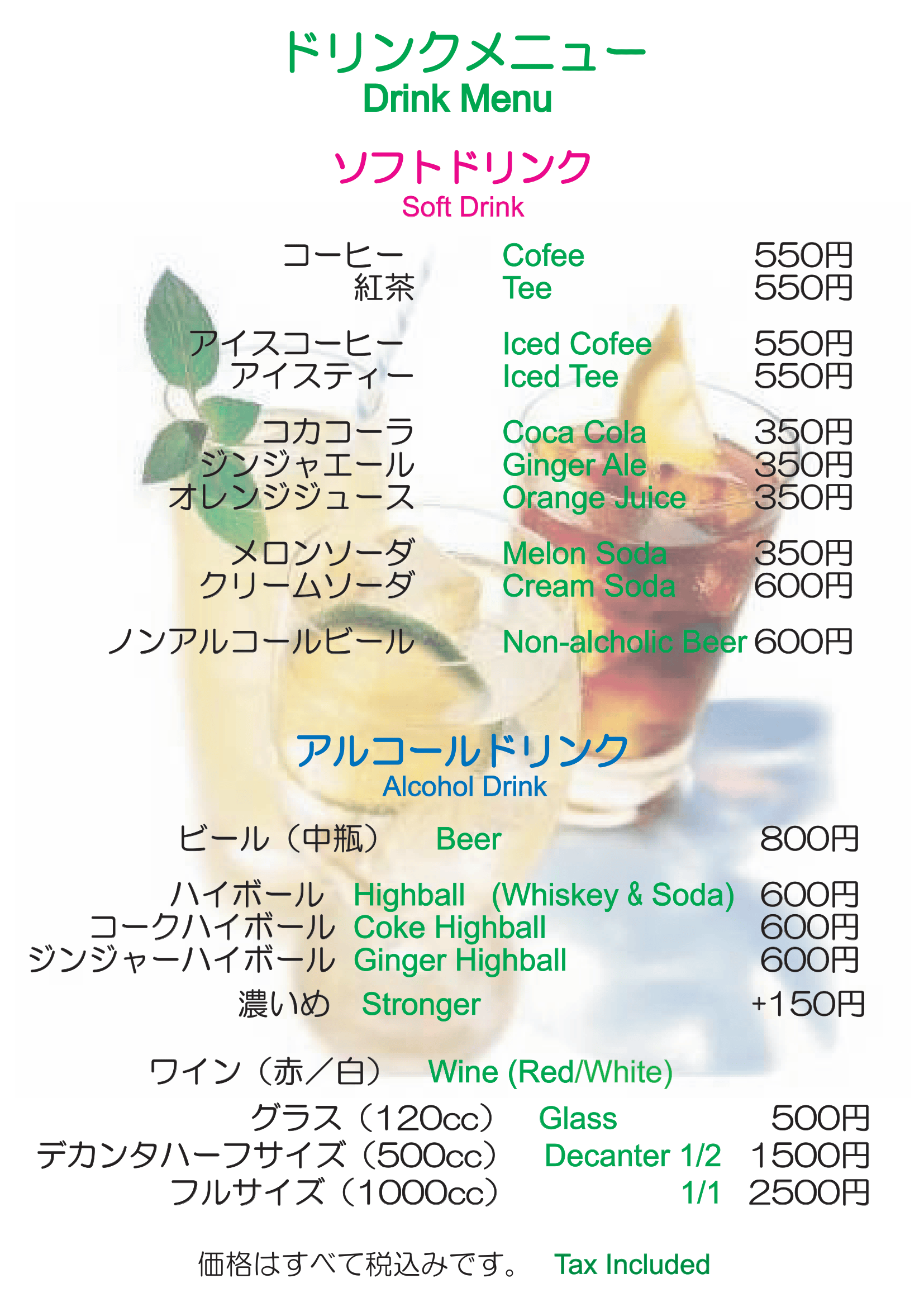 ―ソフトドリンク― ・コーヒー 550円 ・アイスコーヒー550円 ・紅茶 550円 ・アイスティー 550円 ・ノンアルコールビール 600円 ・コーラ ・ジンジャーエール ・メロンソーダ ・オレンジジュース (各350円) ・クリームソーダ600円