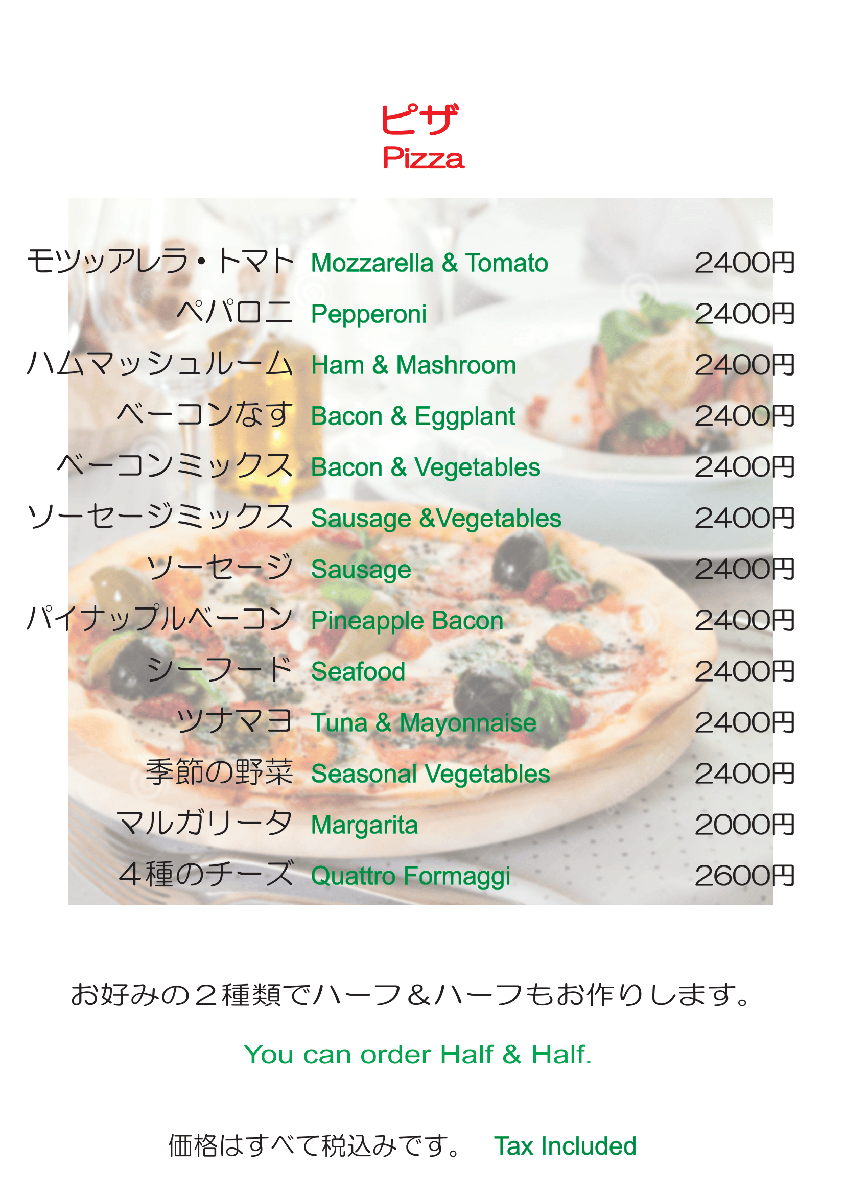 ・四種のチーズ (2600円) ・マルガリータ (2000円) ☆ハーフ&ハーフ お好みの2種類をお選びください。